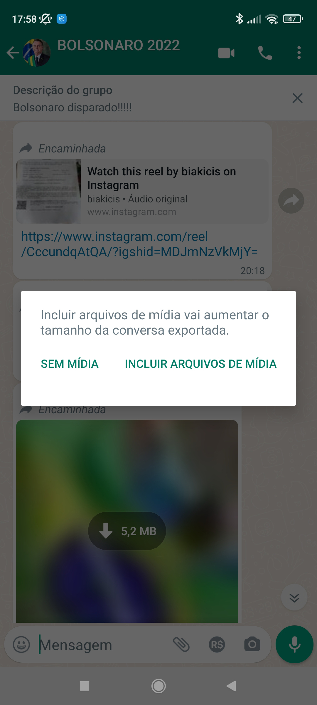 - O WhatsApp perguntará sobre a opção de exportação. Para as finalidades deste curso, a opção Sem Mídia é suficiente.